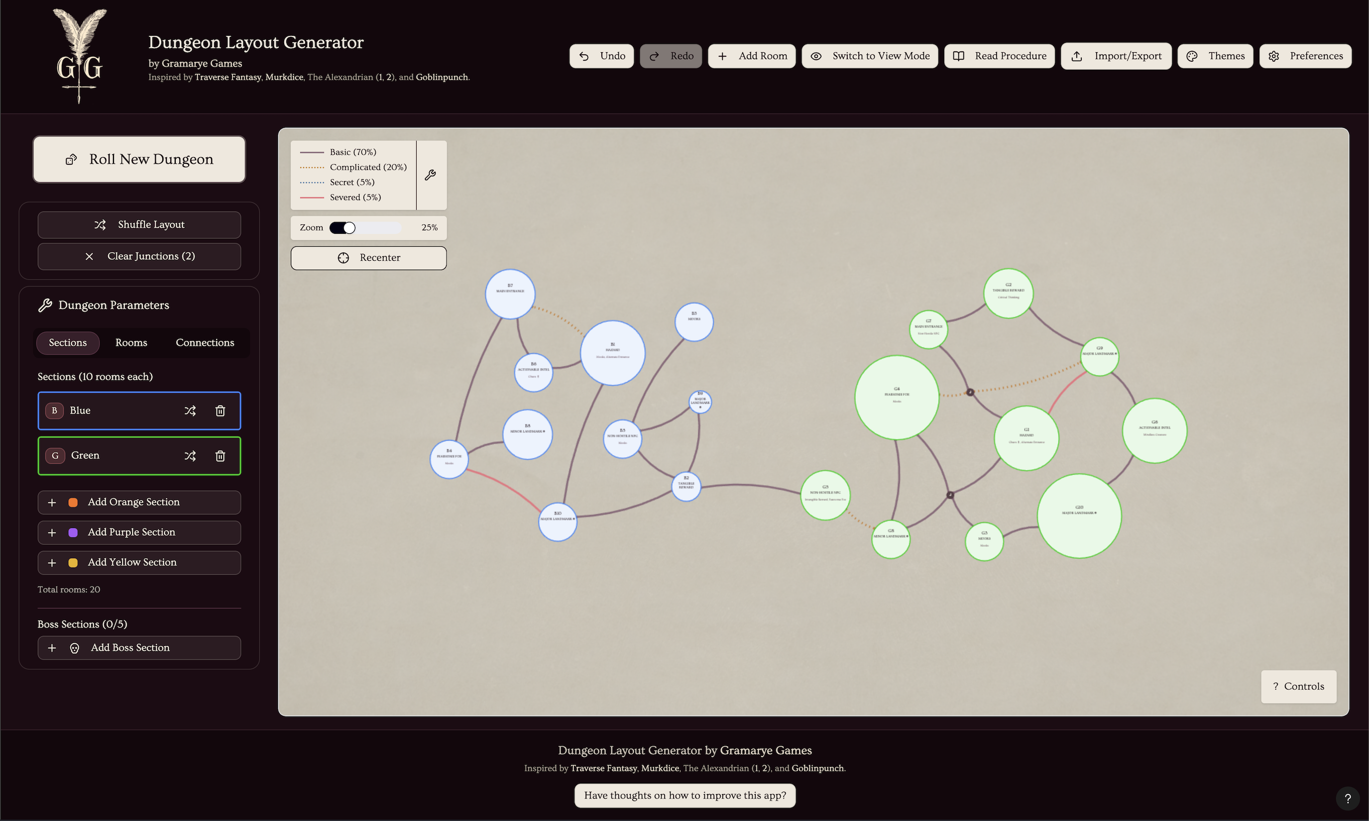 This application builds dungeon layouts using a detailed procedure from 10-room "sections" (levels, districts, or faction territories). Great for any TTRPG with dungeon-like spaces.